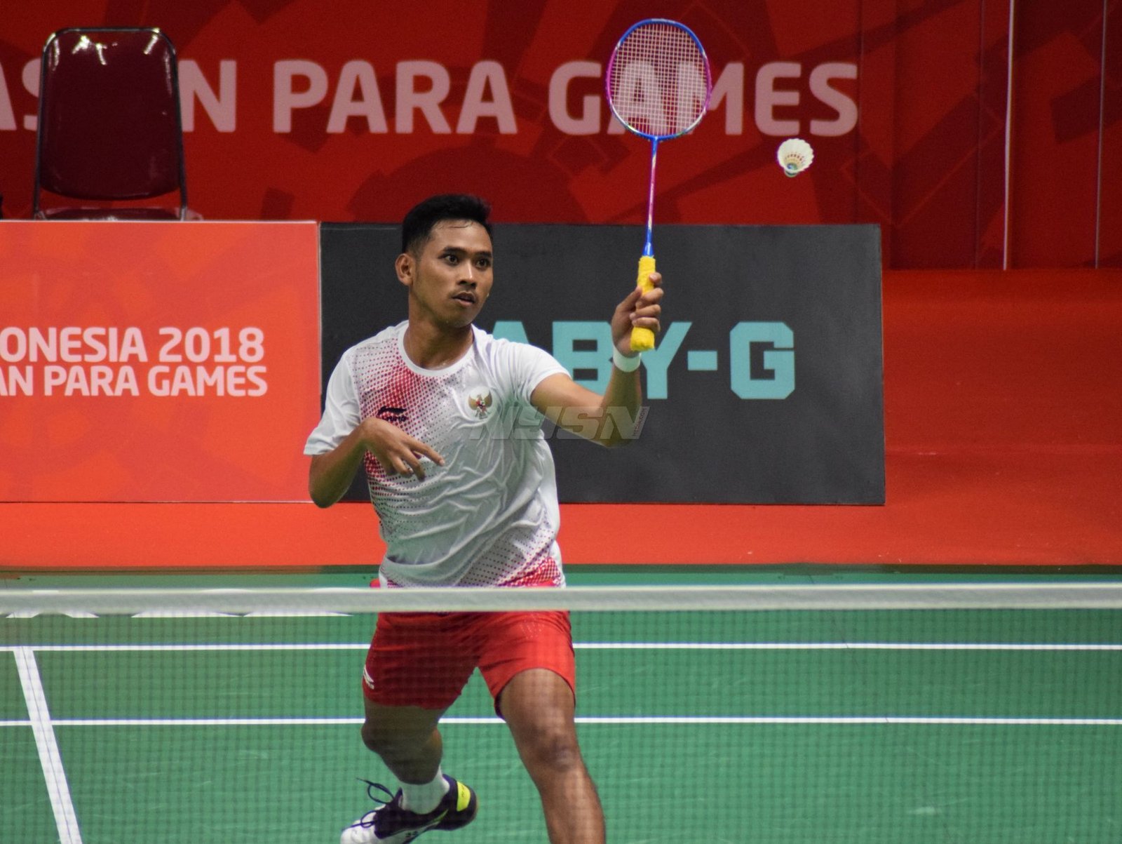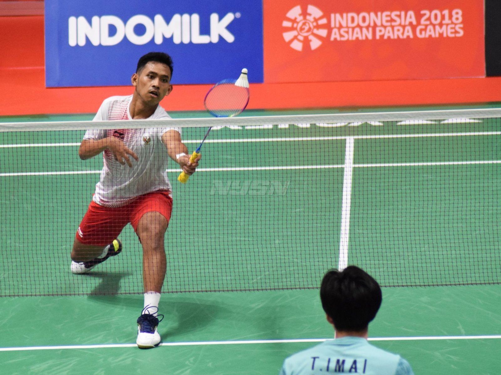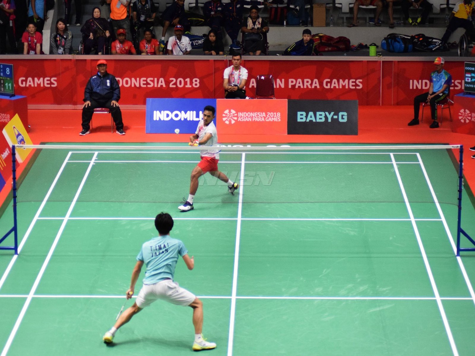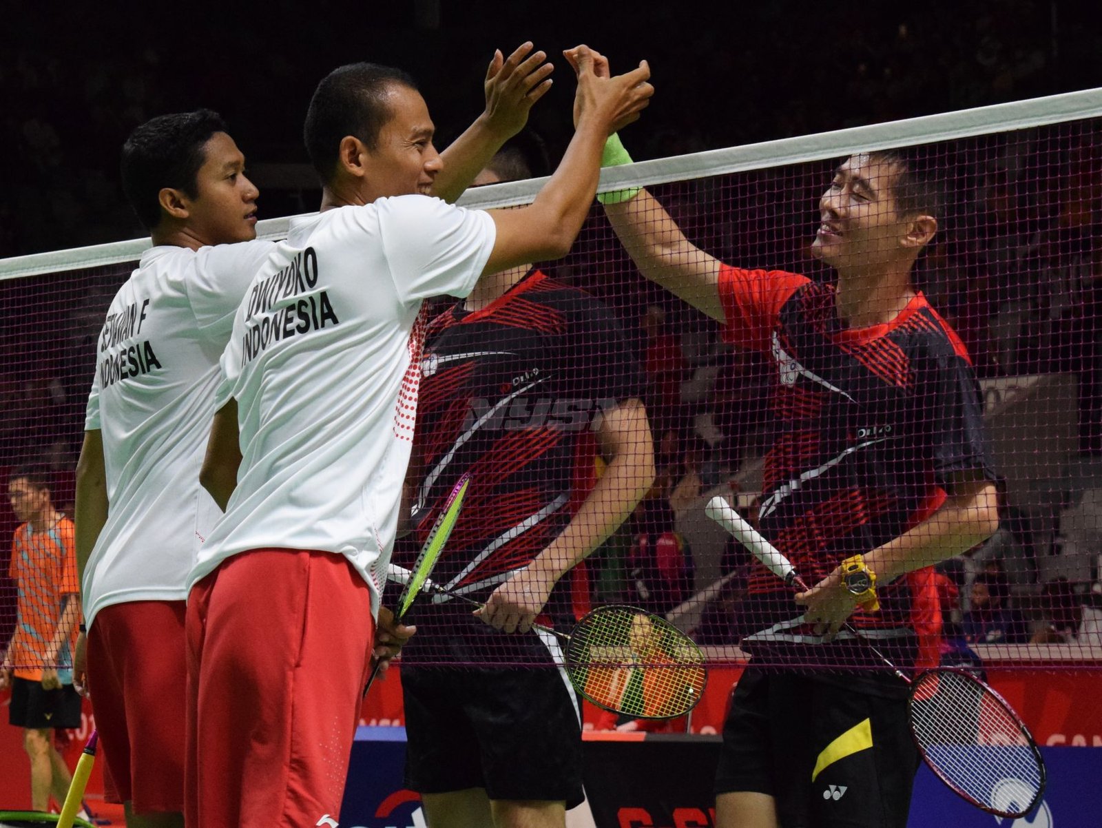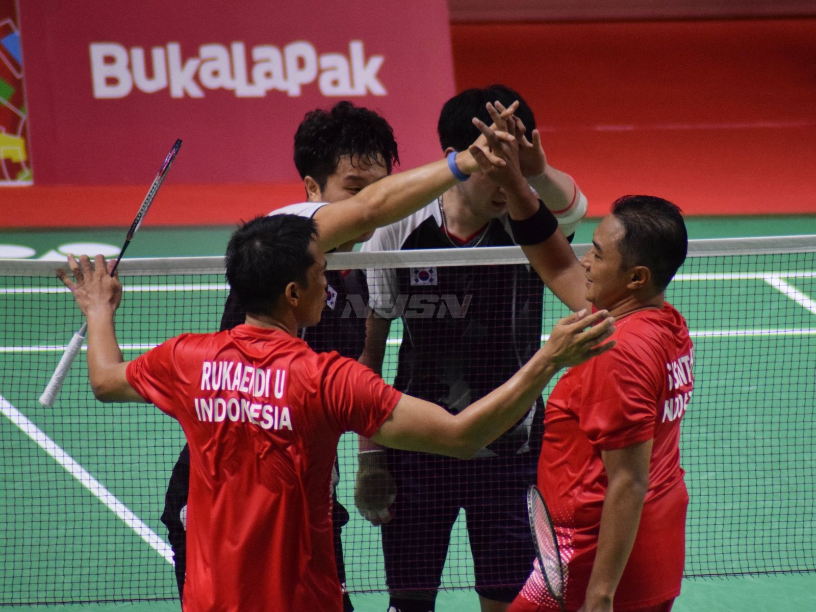 Ukun Rukaendi/Hary Susanto memberi selamat kepada pasangan Korea Selatan (Korsel) Sun Woo Jeon/Dong Jae Joo setelah takluk di laga perempat final cabang olahraga bulutangkis kategori SL3-SL4 (kecacatan kaki), di Istora Senayan, Jakarta (11/10). (Rizal/NYSN)