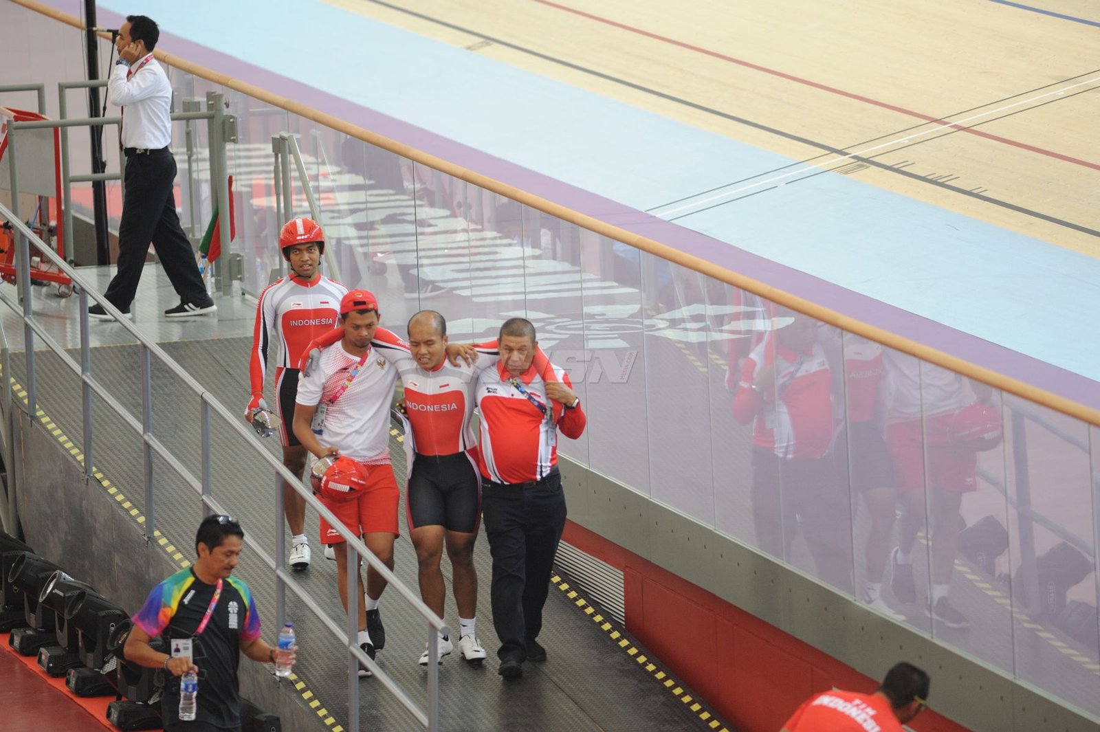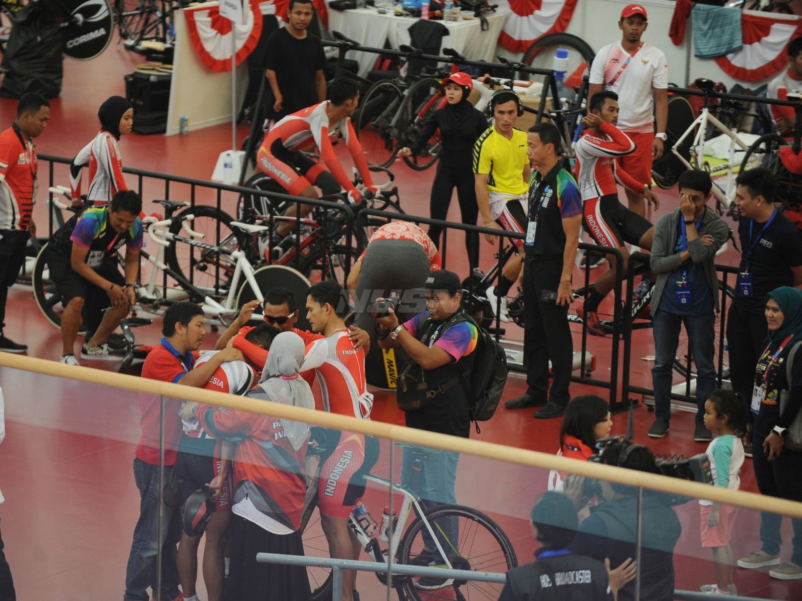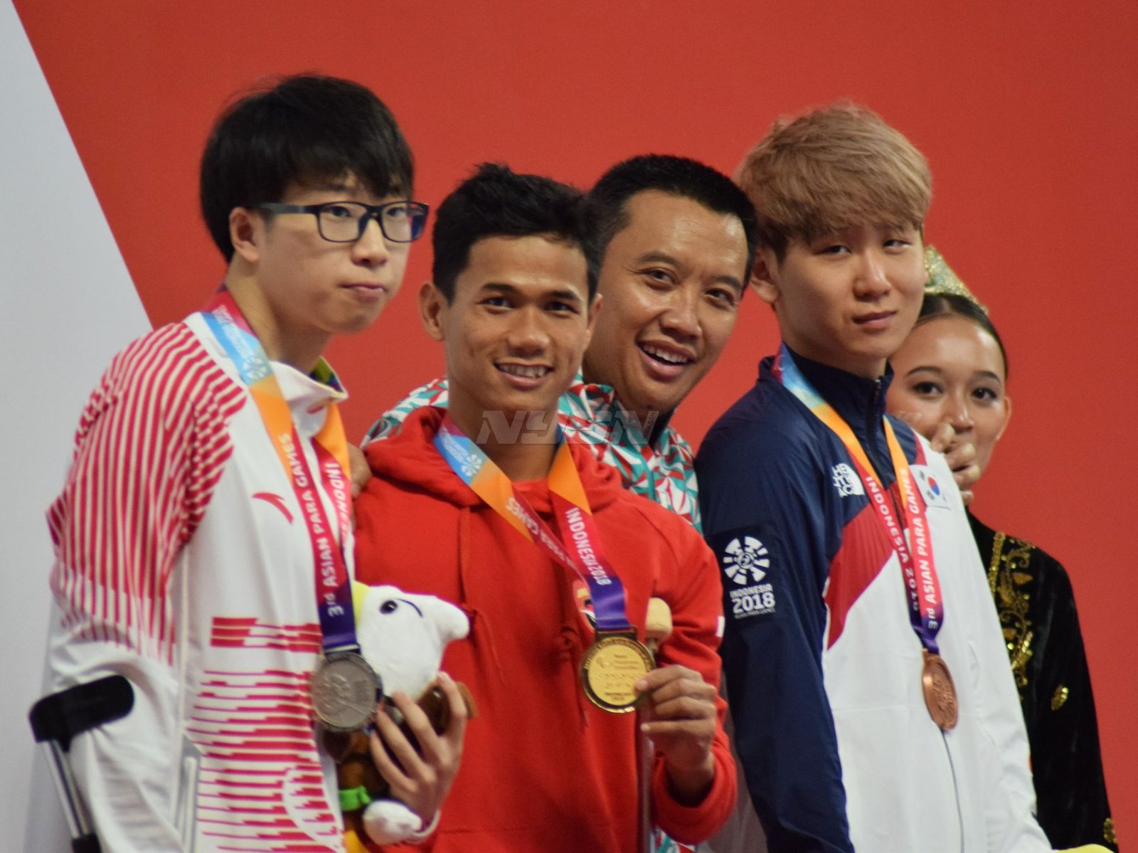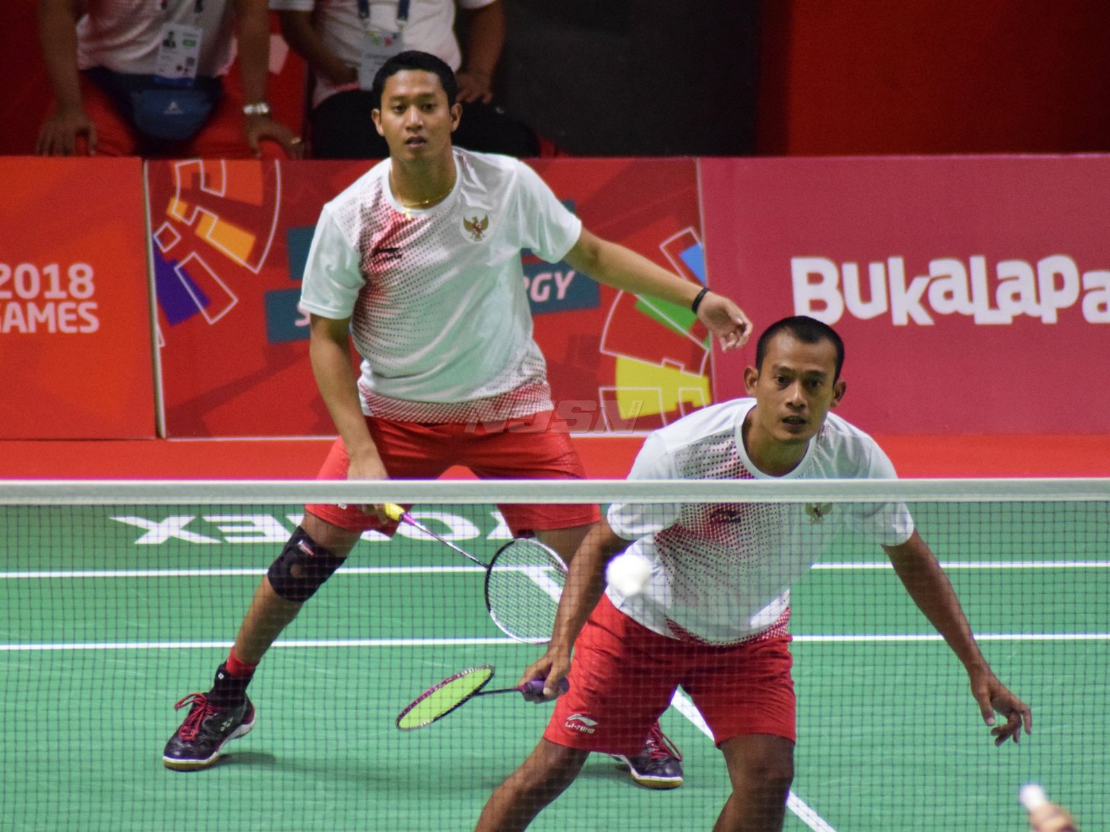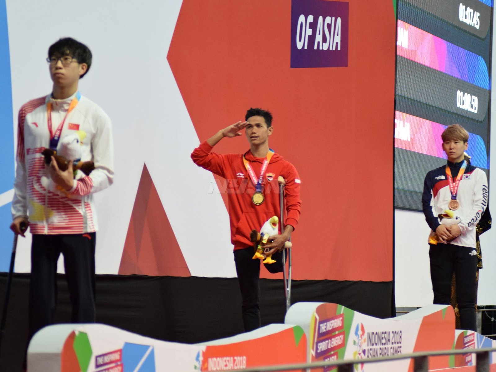 Ukun Rukaendi/Hary Susanto memberi selamat kepada pasangan Korea Selatan (Korsel) Sun Woo Jeon/Dong Jae Joo setelah takluk di laga perempat final cabang olahraga bulutangkis kategori SL3-SL4 (kecacatan kaki), di Istora Senayan, Jakarta (11/10). (Rizal/NYSN)