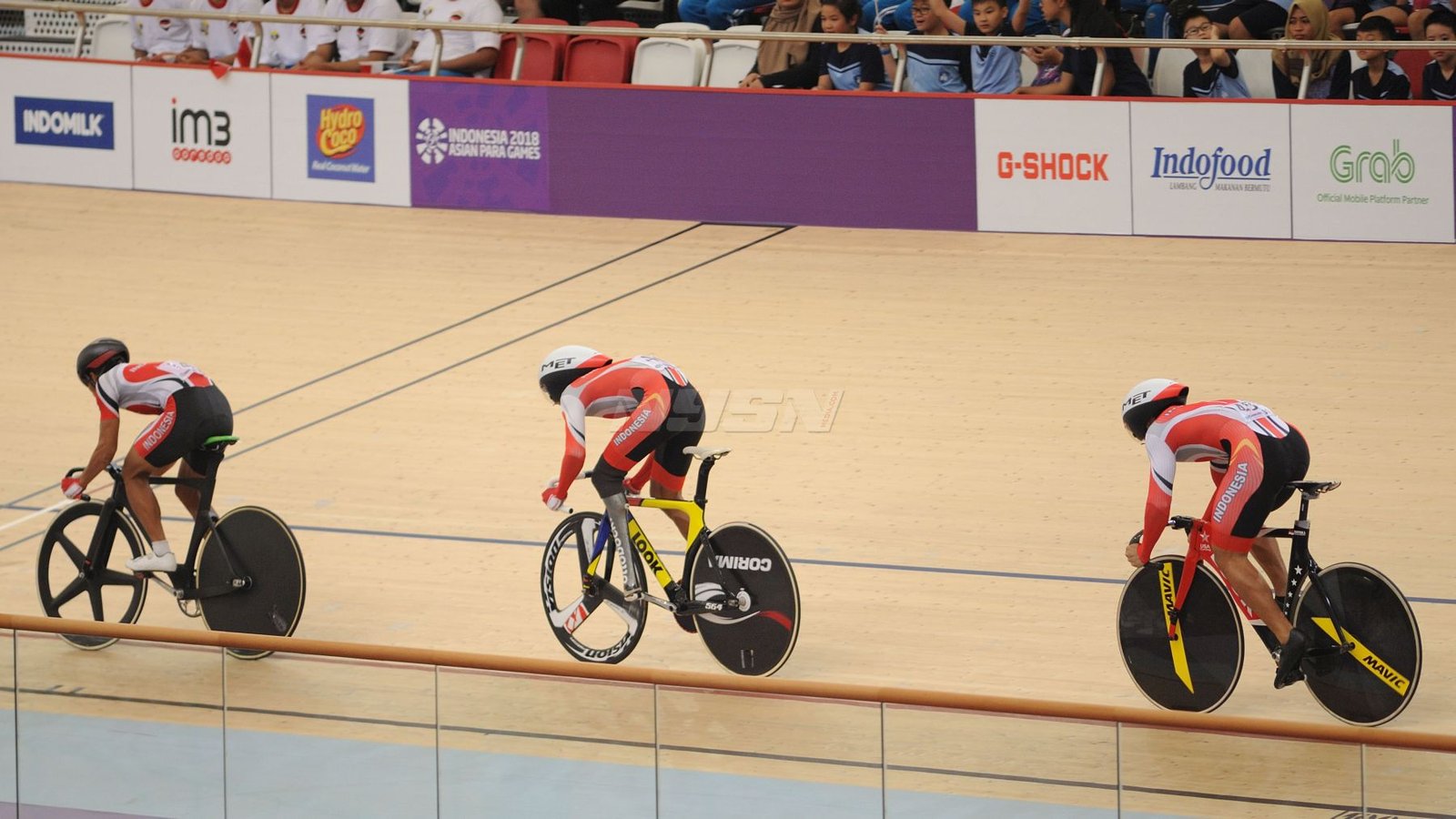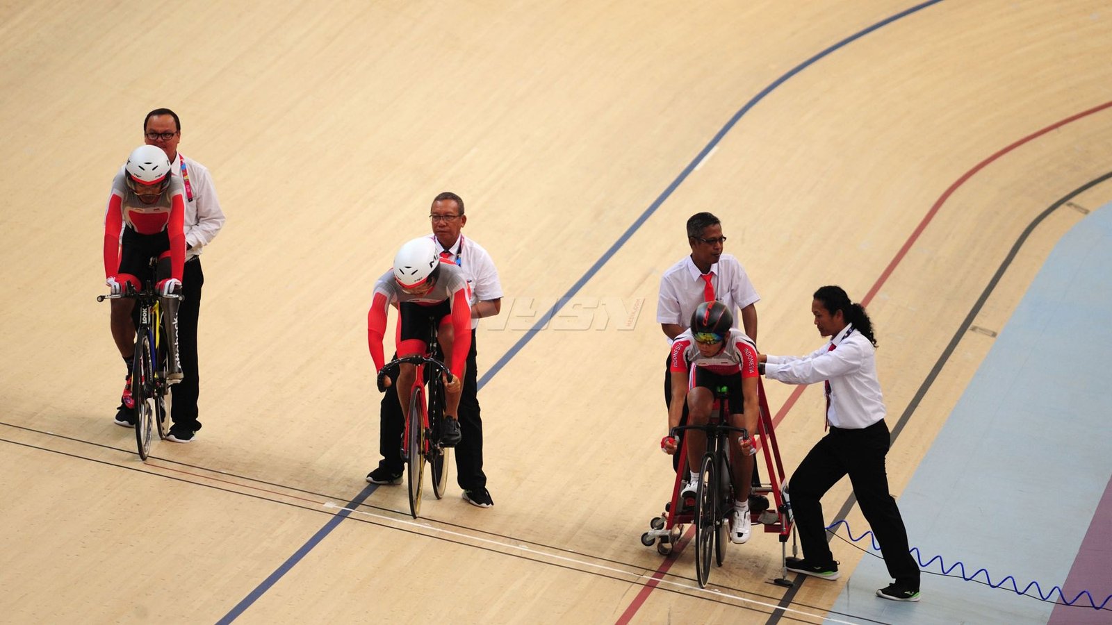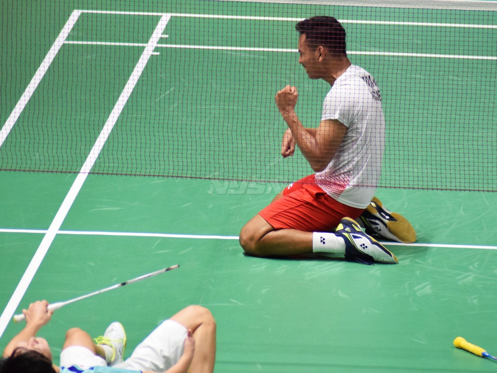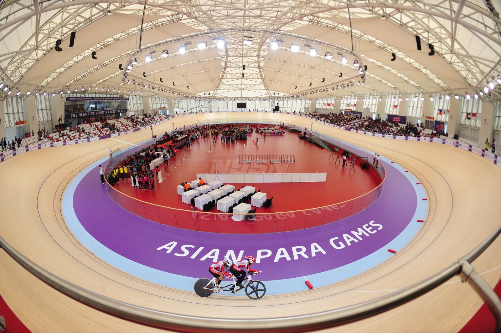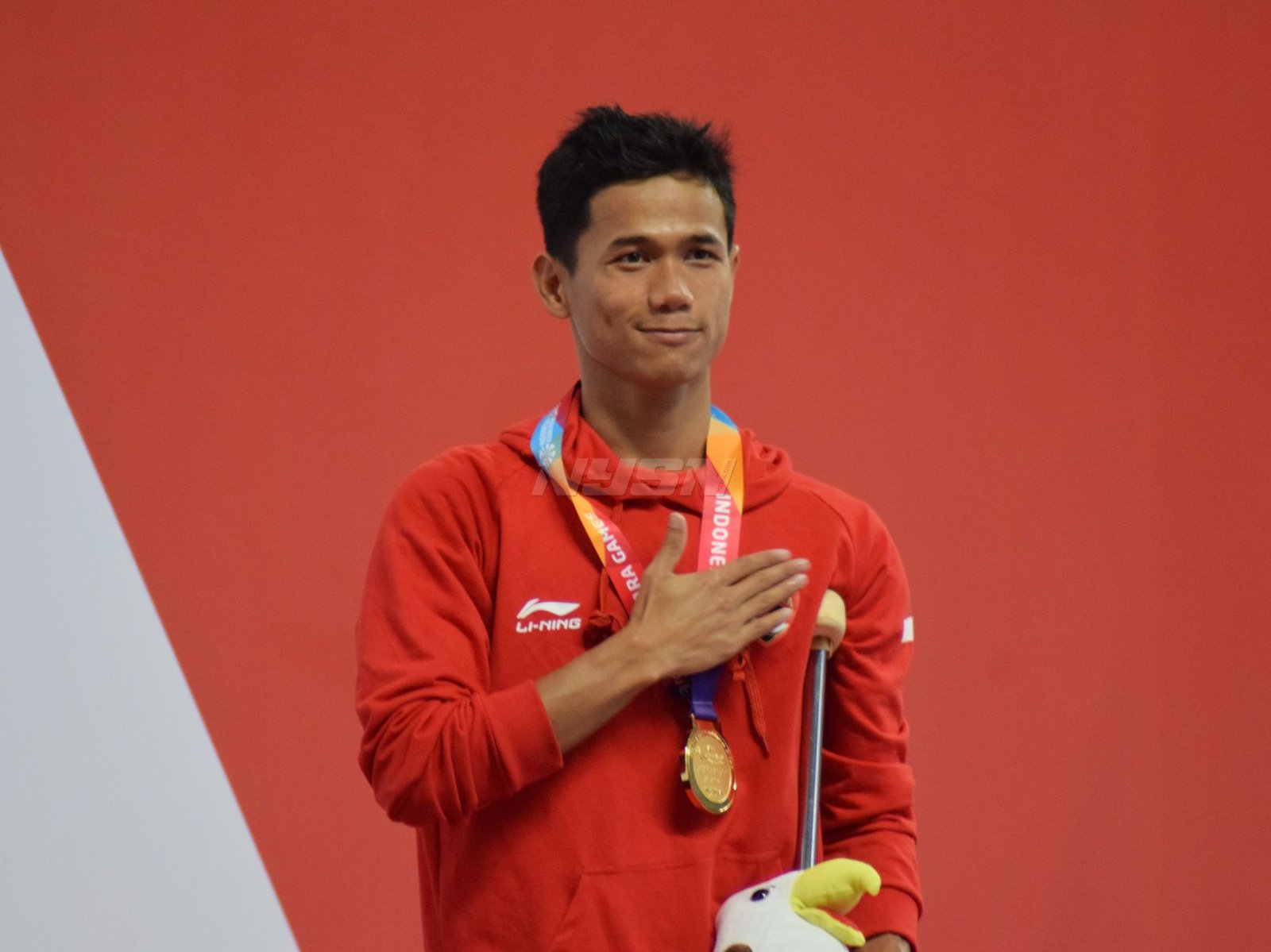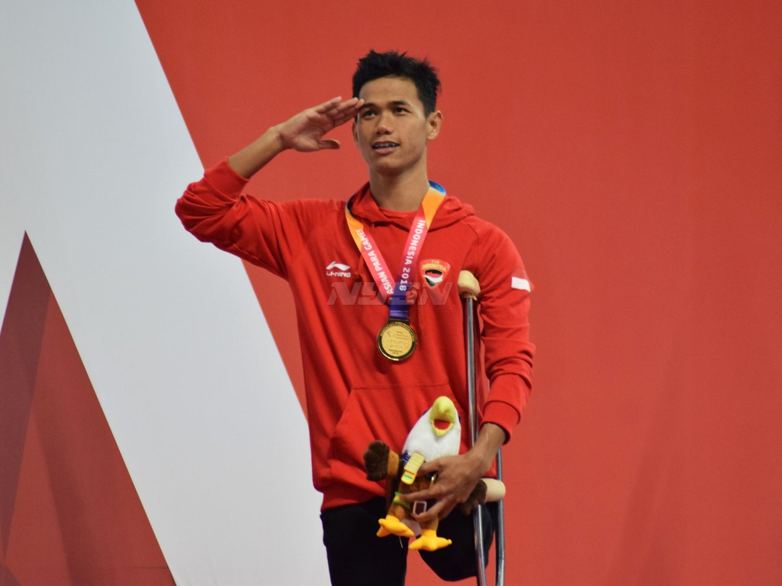 Ukun Rukaendi/Hary Susanto memberi selamat kepada pasangan Korea Selatan (Korsel) Sun Woo Jeon/Dong Jae Joo setelah takluk di laga perempat final cabang olahraga bulutangkis kategori SL3-SL4 (kecacatan kaki), di Istora Senayan, Jakarta (11/10). (Rizal/NYSN)