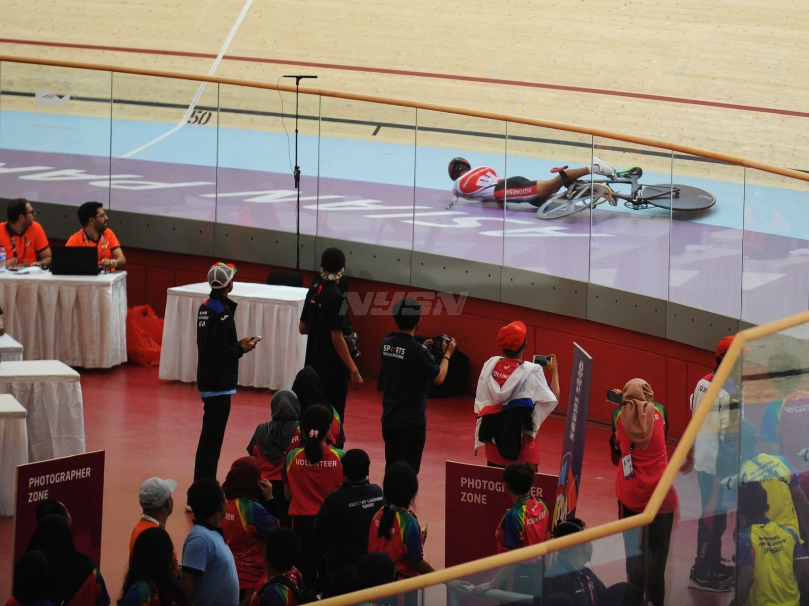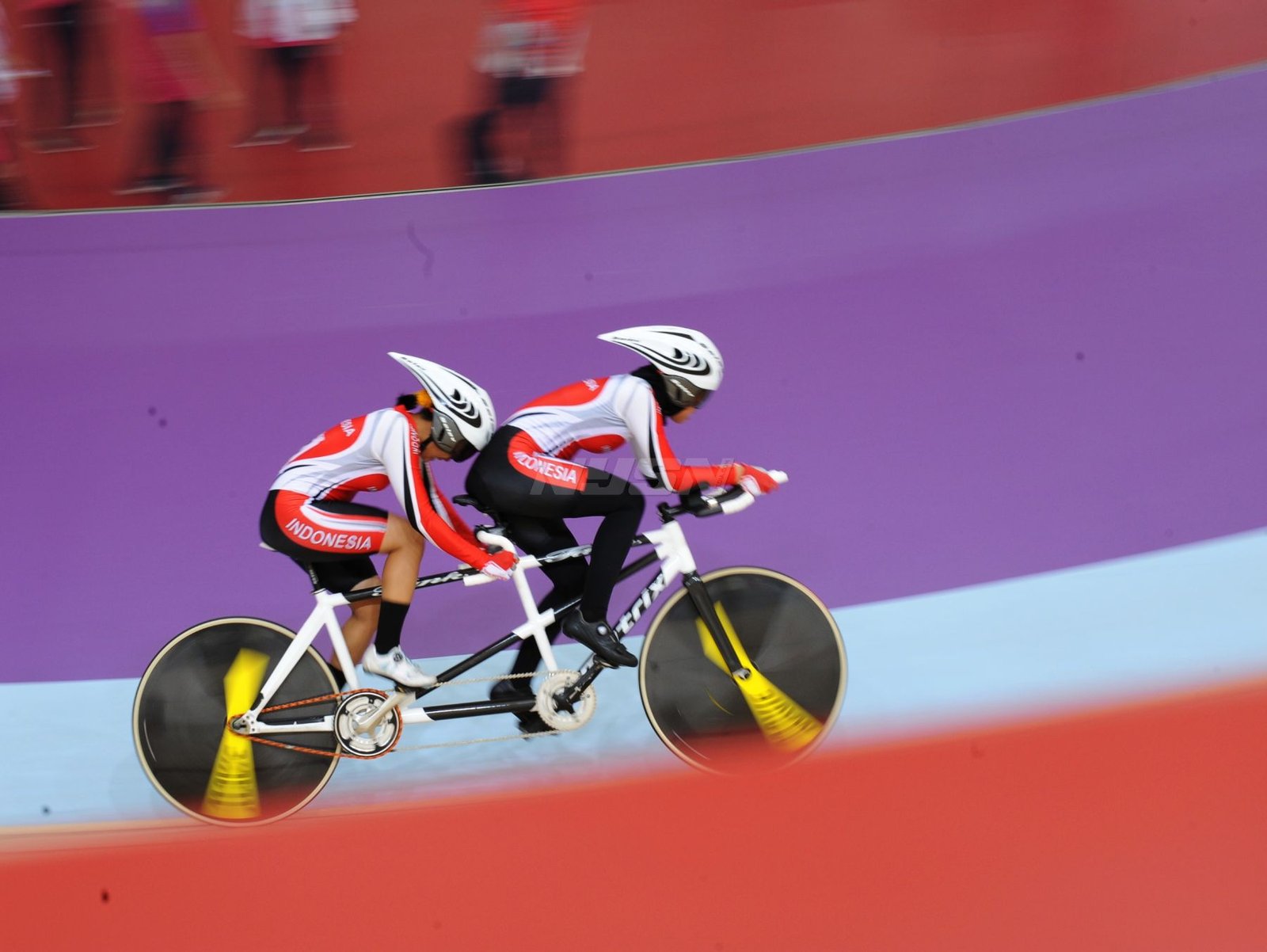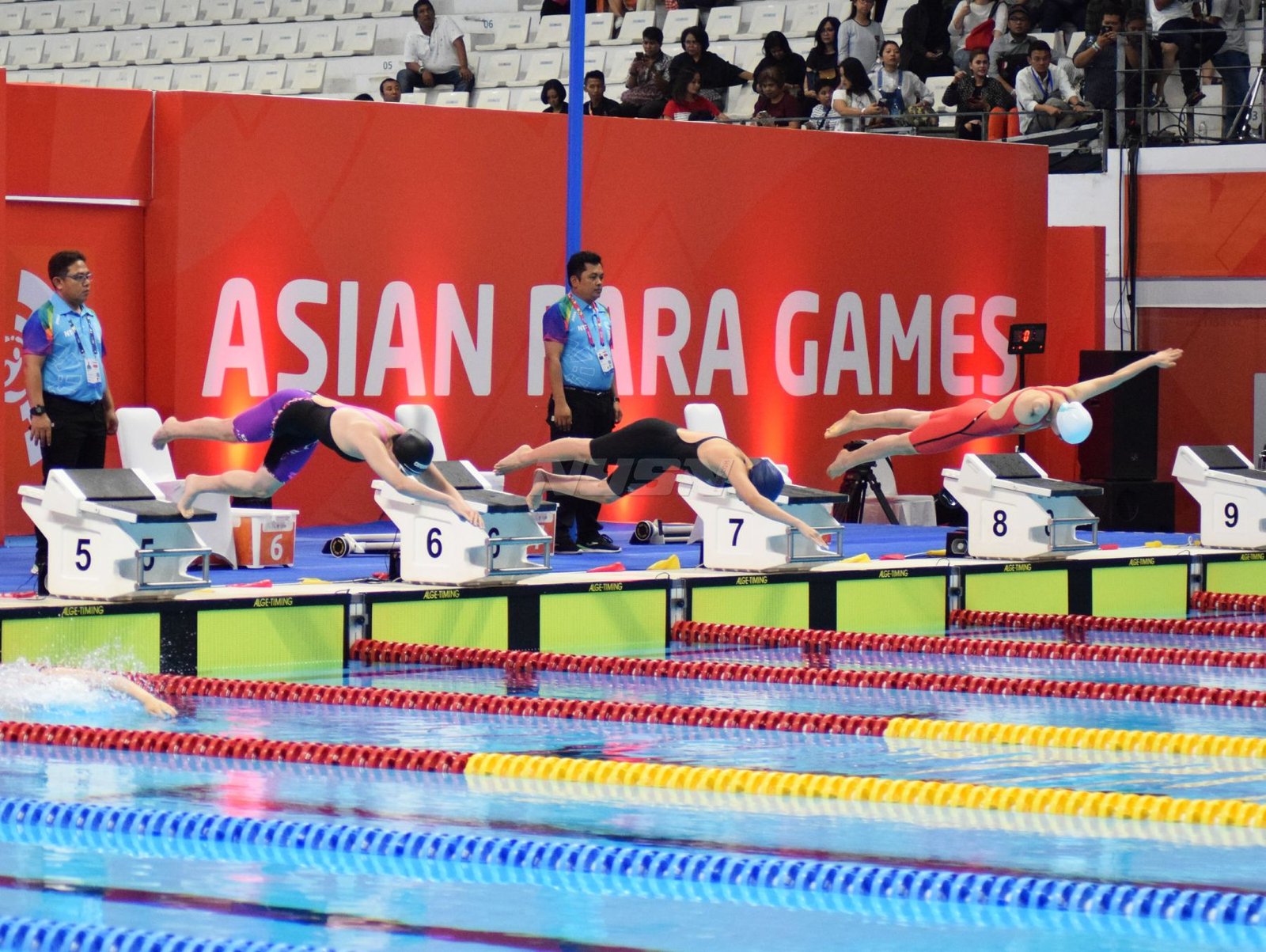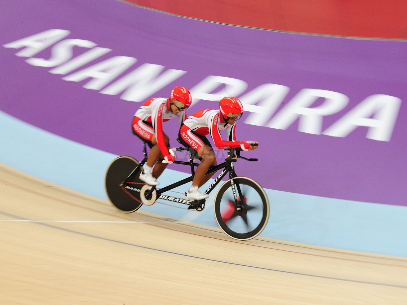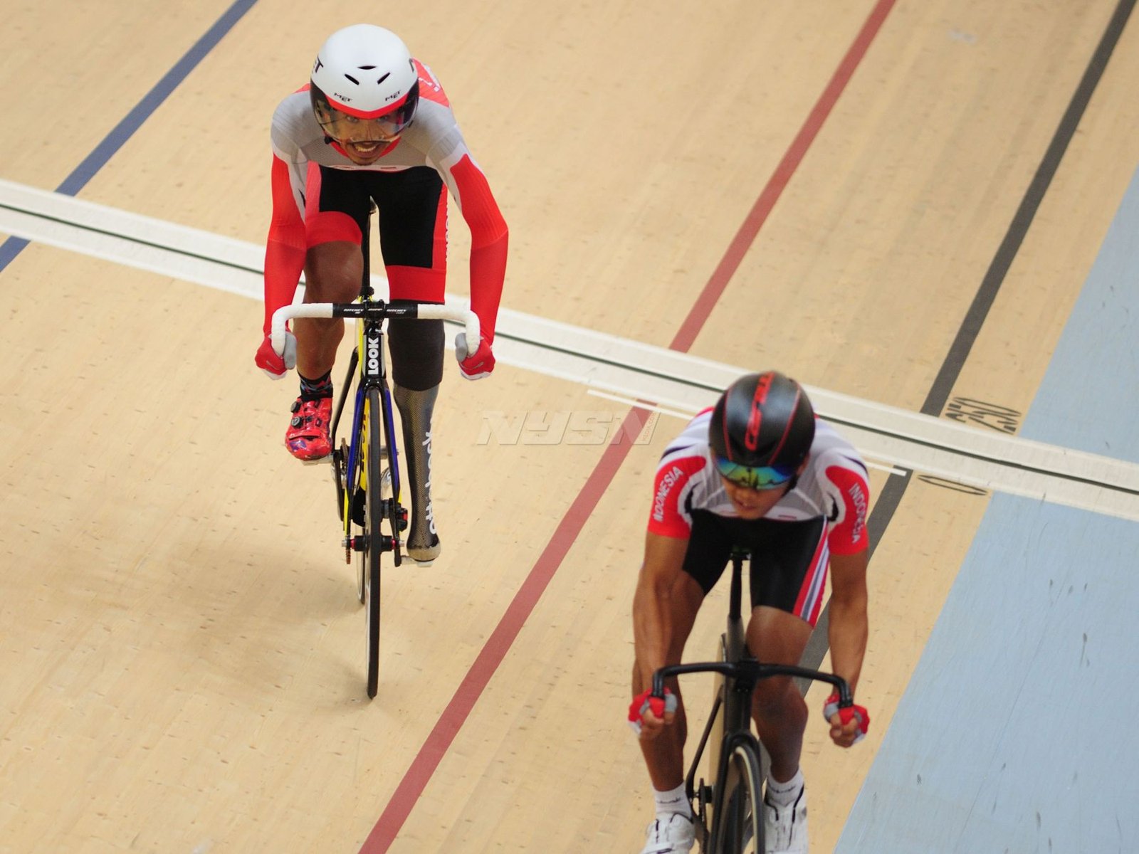 Ukun Rukaendi/Hary Susanto memberi selamat kepada pasangan Korea Selatan (Korsel) Sun Woo Jeon/Dong Jae Joo setelah takluk di laga perempat final cabang olahraga bulutangkis kategori SL3-SL4 (kecacatan kaki), di Istora Senayan, Jakarta (11/10). (Rizal/NYSN)