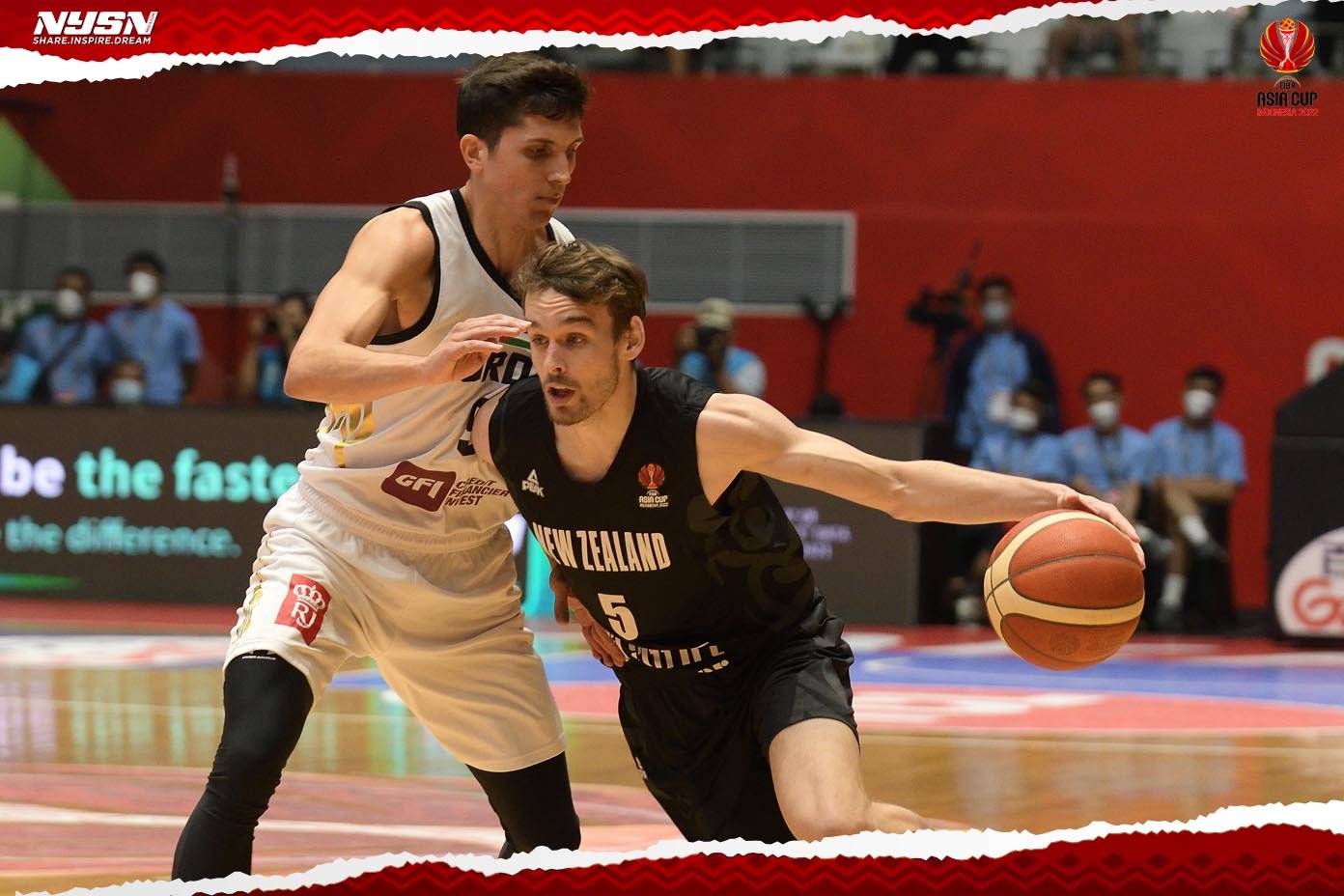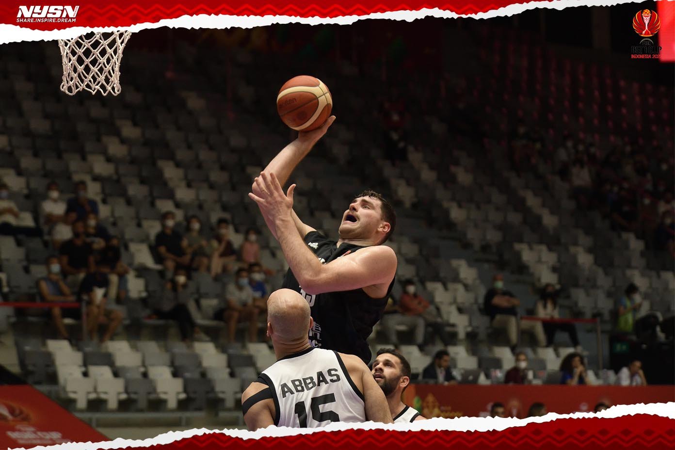 Pemain Jordan Hashem Abbaas (jersey putih nomer 21) berusaha membidik ring New Zealand.