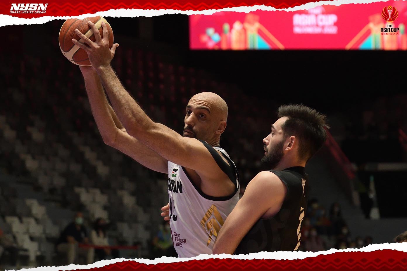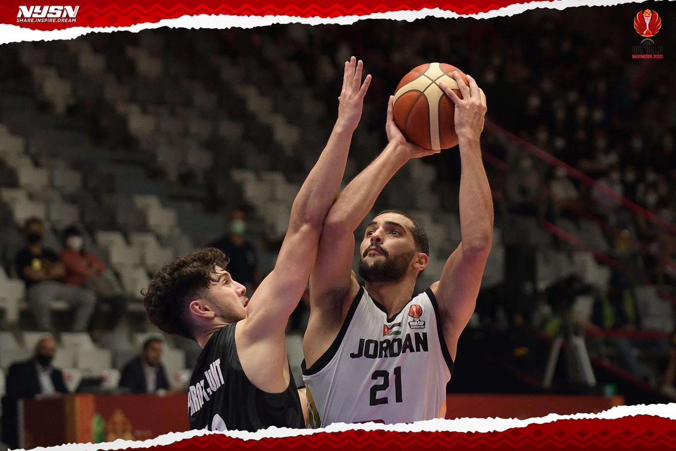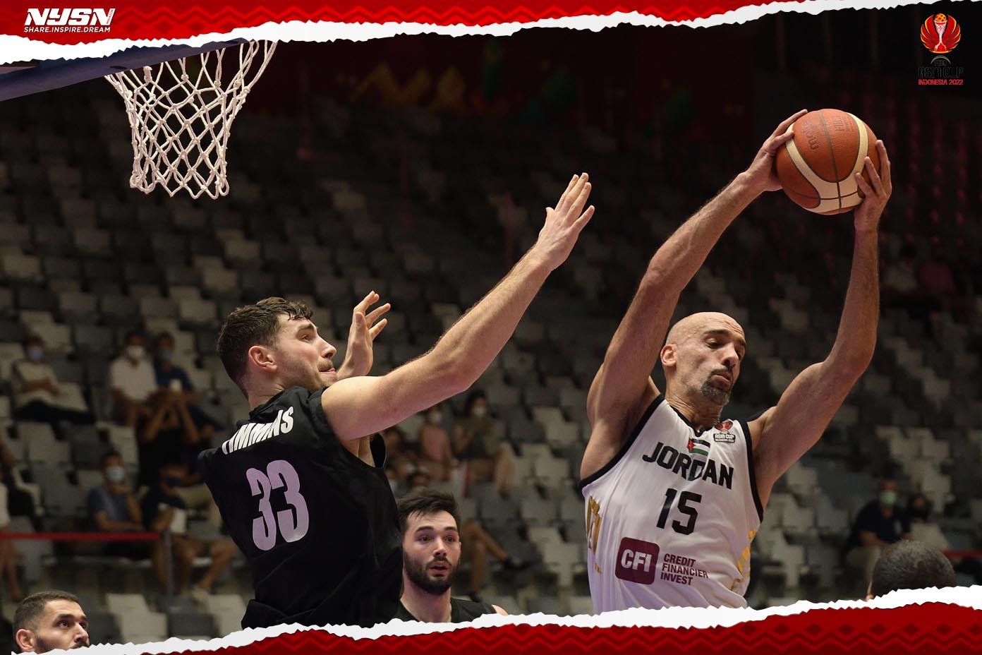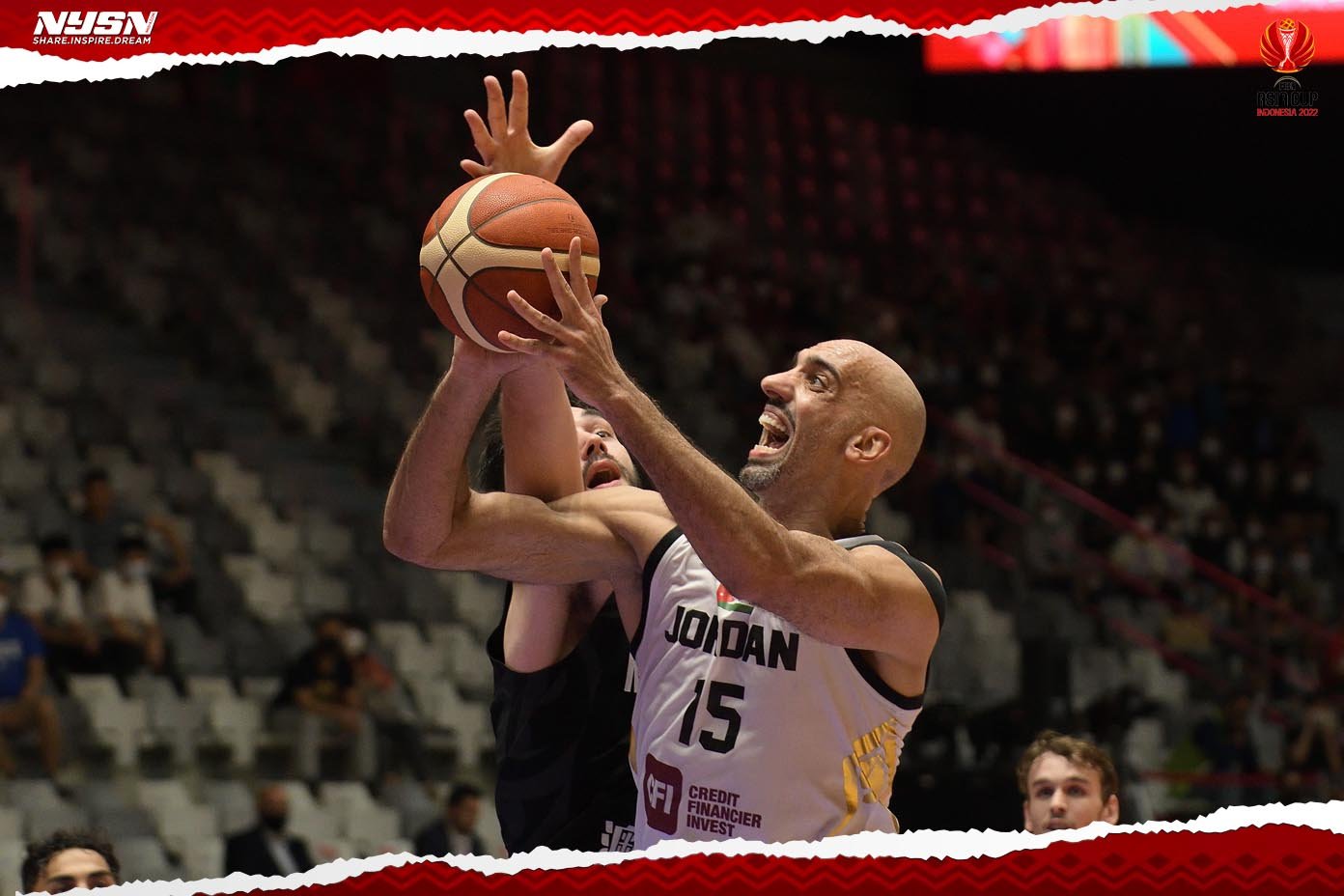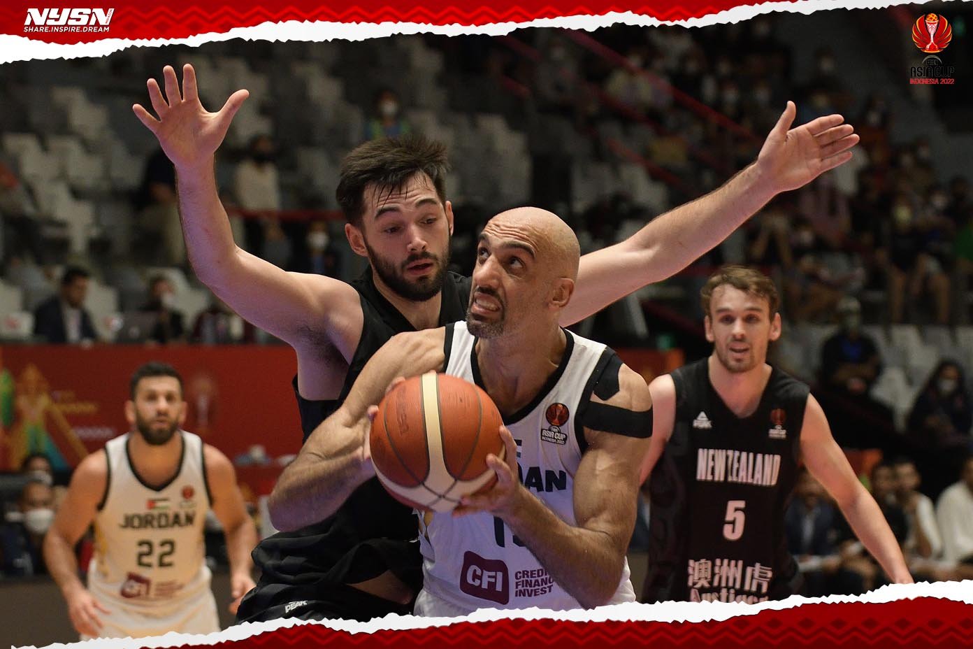 Pemain Yordania Hashem Abbaas mencoba menembus pertahanan New Zealand pada laga perebutan juara ketiga FIBA Asia Cup 2022 di Istora Senayan, Jakarta, Indonesia. Minggu (24/07).