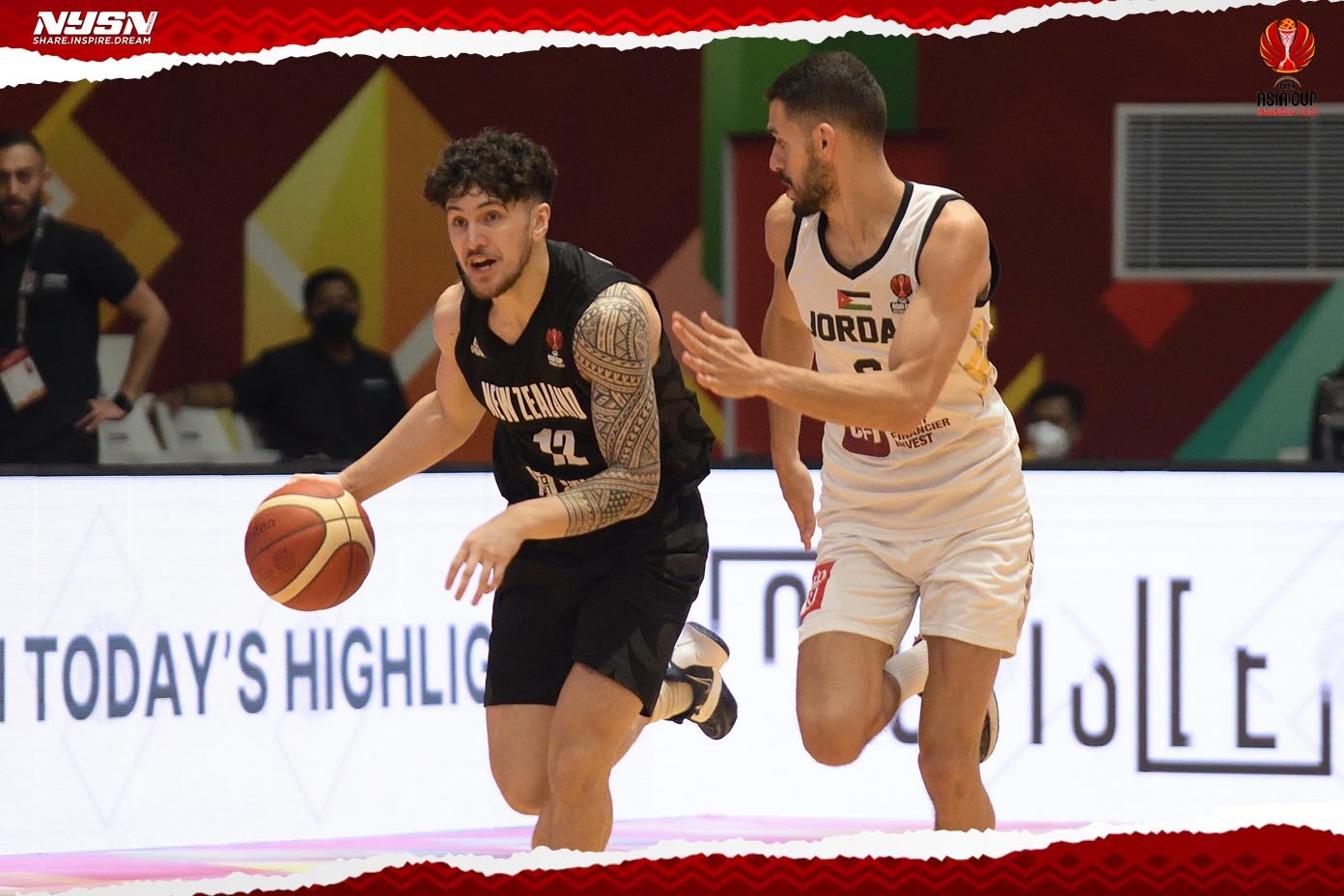 Pemain New Zealand Kruz Perrott-Hunt (jersey hitam nomer 12) berusaha menggagalkan serangan pemain Jordan.