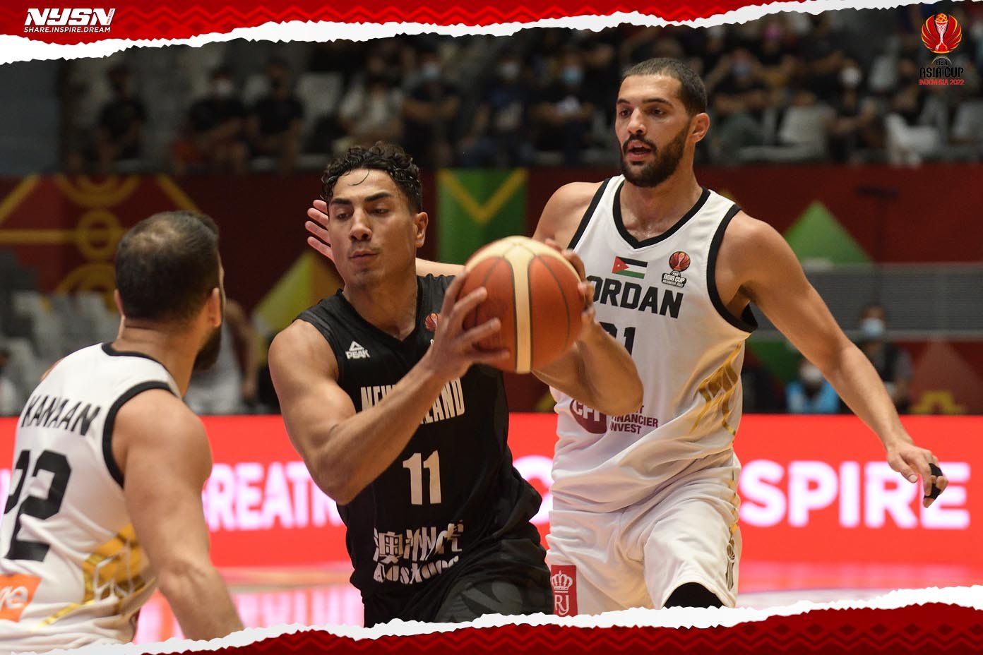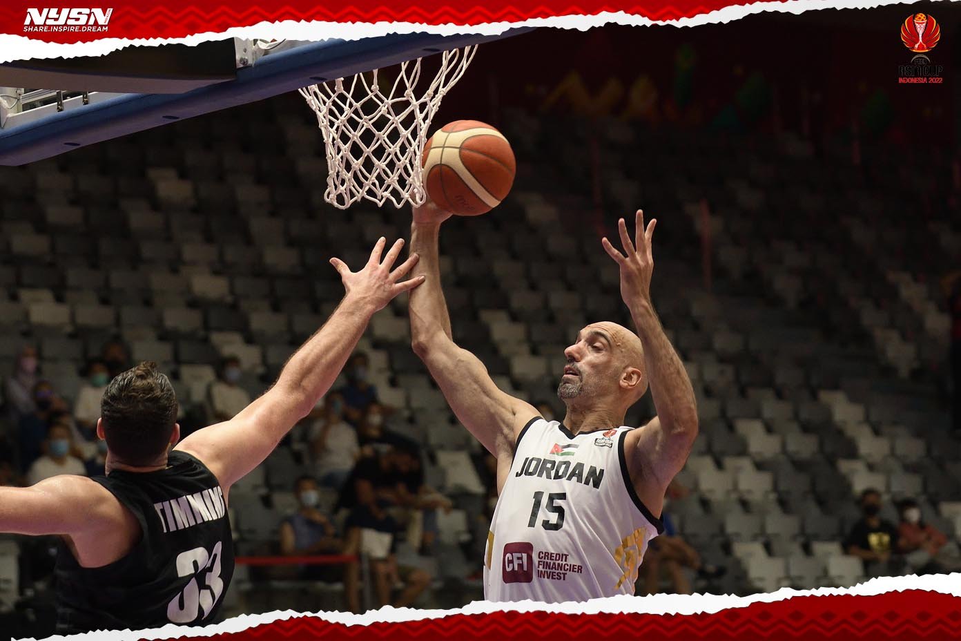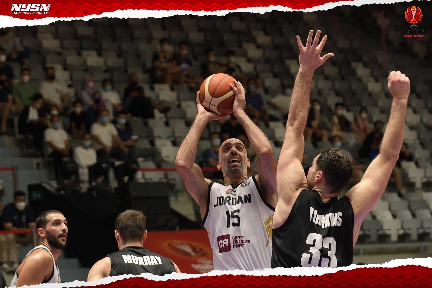 Pemain Jordan Freddy Ibrahim (jersey putih nomer 5) berusaha melepaskan tembakan ke arah ring New Zealand.