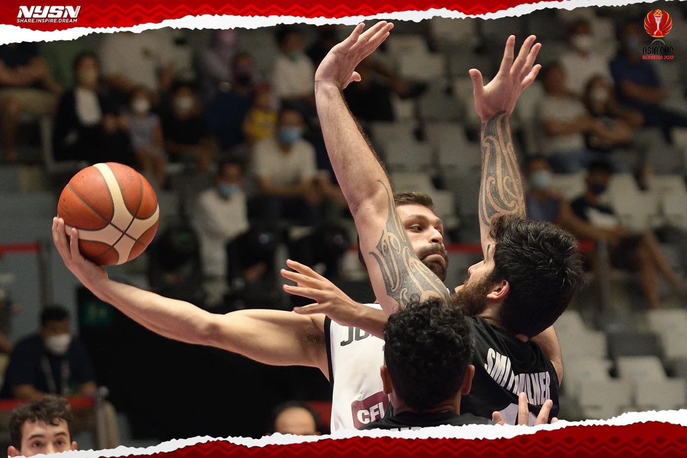 Pemain New Zealand Kruz Perrott-Hunt (jersey hitam nomer 12) dan pemain Jordan Hashem Abbaas (jersey putih nomer 21) berebut bola yang jatuh ke lantai.