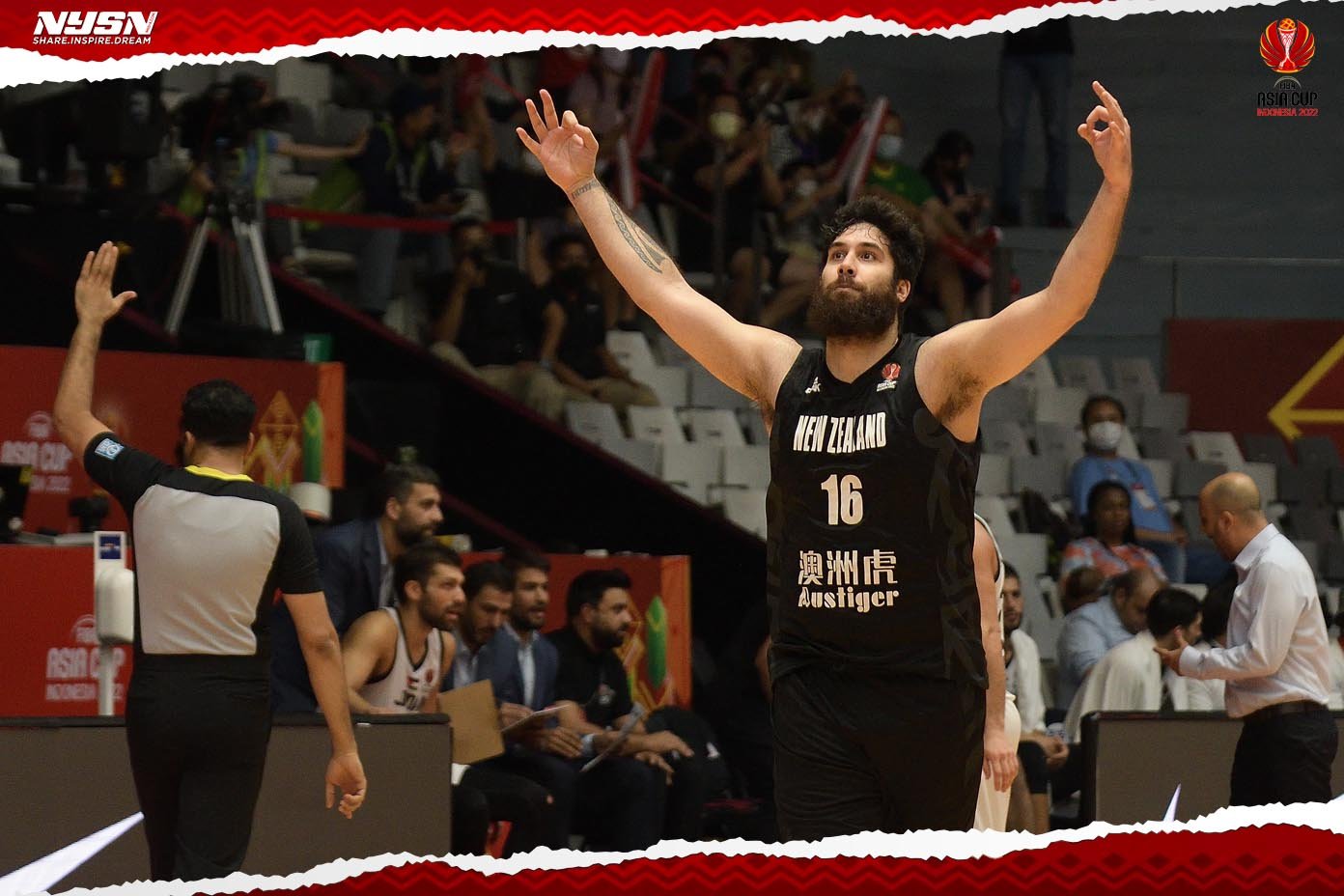 Selebrasi pemain New Zealand Tohi Smith-Miner setelah berhasil melakukan tembakan tiga angka.