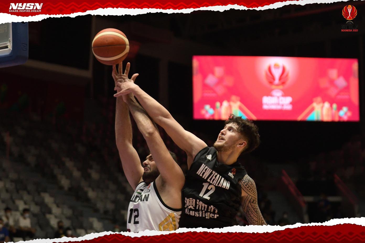 Pemain Jordan Zaid Abbas (jersey putih no 15) berebut bola rebound dengan pemain New Zealand Sam Timmins (jersey hitam no 33).