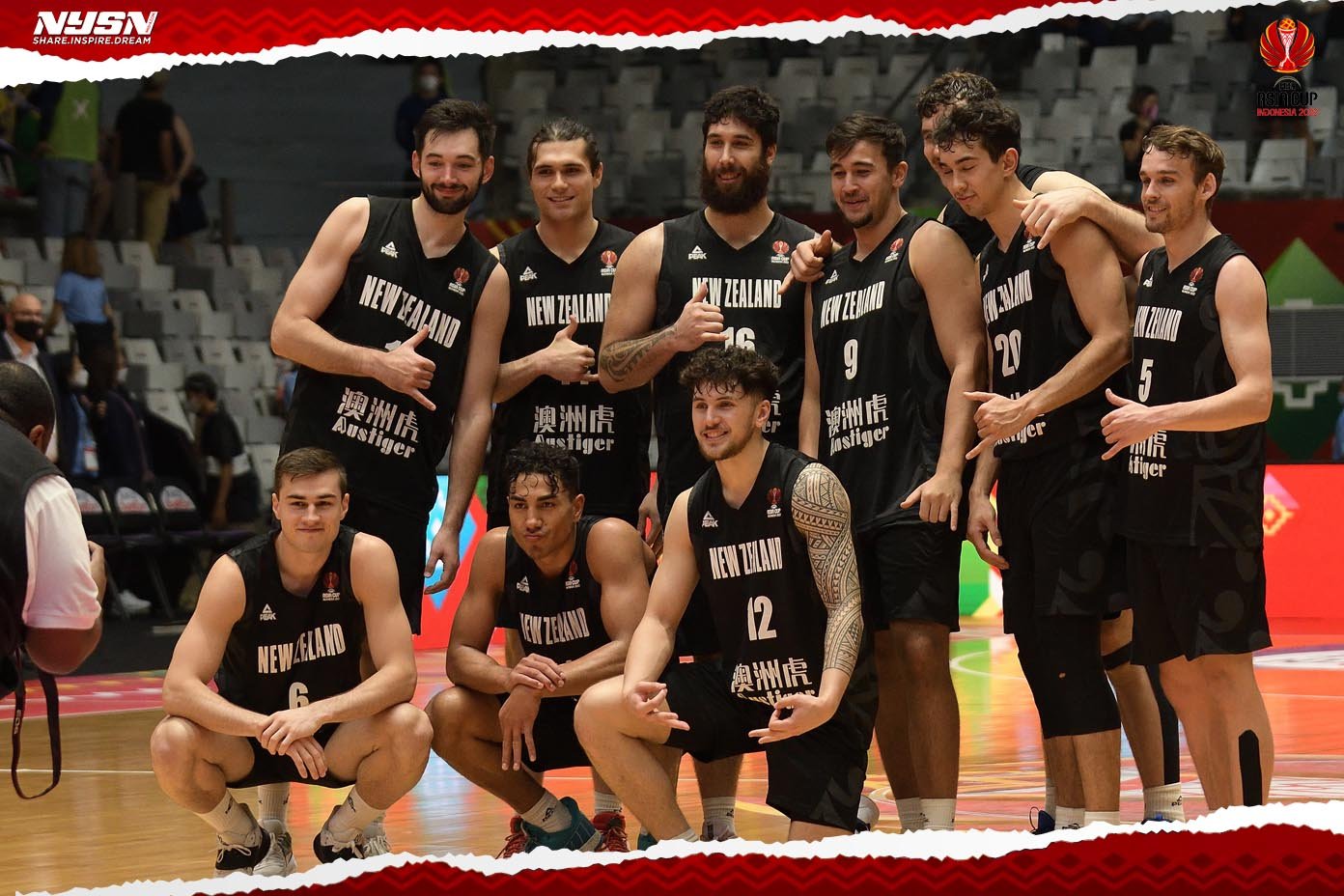 Tim bolabasket New Zealand berpose bersama usai mengalahkan Jordan 83-75 dan merebut tempat ketiga FIBA Asia Cup 2022 di Istora Senayan, Jakarta, Indonesia. Minggu (24/07).