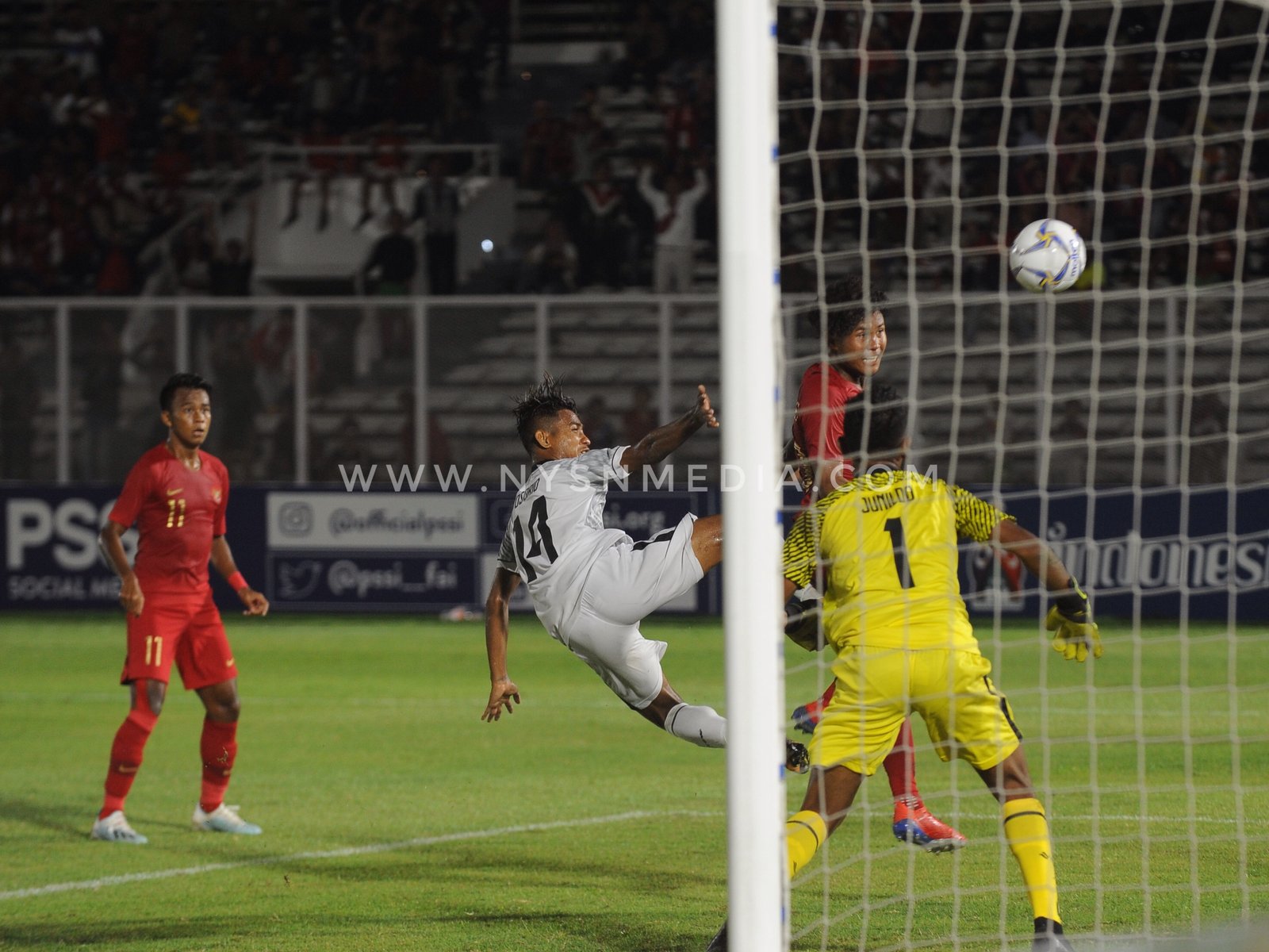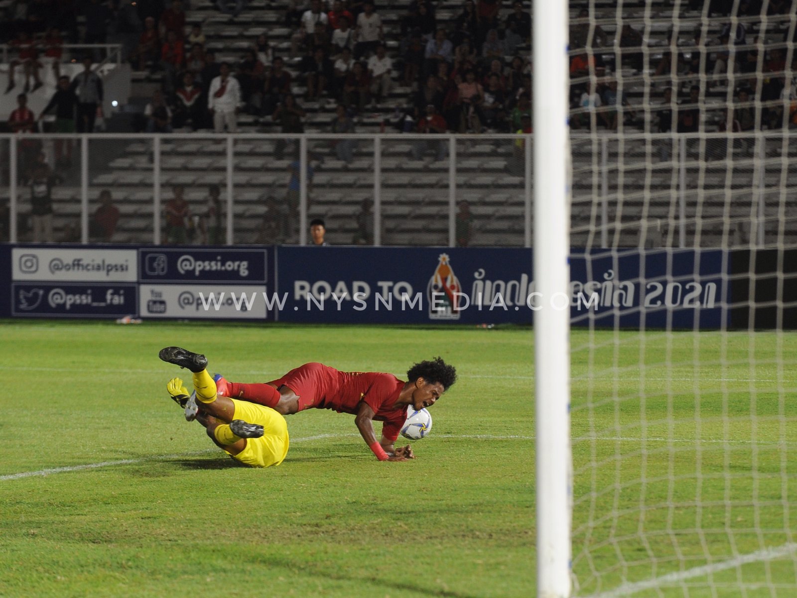 Pemain timnas Indonesia U-19, Beckham Putra Nugraha bersiap menendang bola ke gawang Timor Leste yang dijaga oleh Junildo Manuel. (NYSN/Pras)